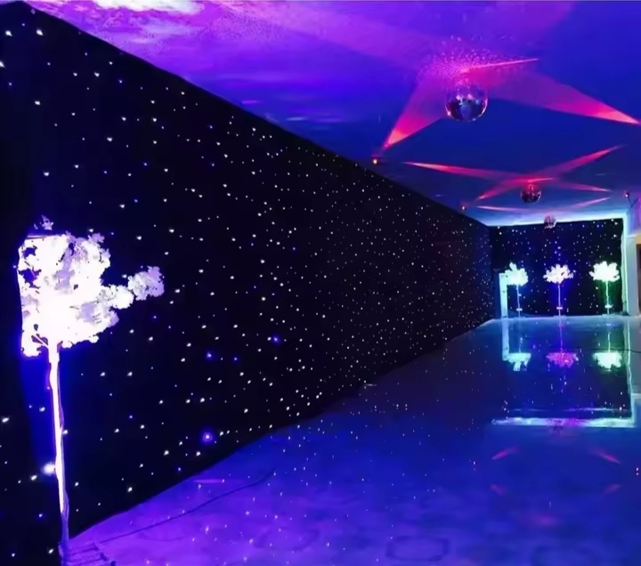 A cortina estrelada em tecido com fibra óptica é uma solução moderna e sofisticada que cria um efeito de céu estrelado em ambientes internos e eventos. Utilizando pontos de luz distribuídos em tecido especial, o sistema proporciona um visual elegante, com iluminação suave e de alto impacto visual.